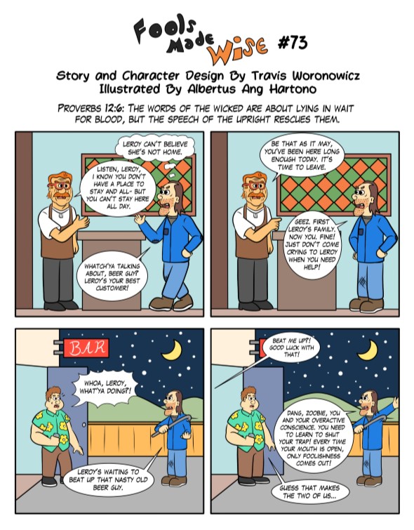 This comic shows us about the power of our words: the words of the wicked are about hurting others, but the words of the upright brings rescue and deliverance. Proverbs 18:21 tells us that death and life are in the power of the tongue, and those who love it will eat its fruits. May we be a people who, because of Jesus, love to bless instead of curse, bringing life instead of death with our words.